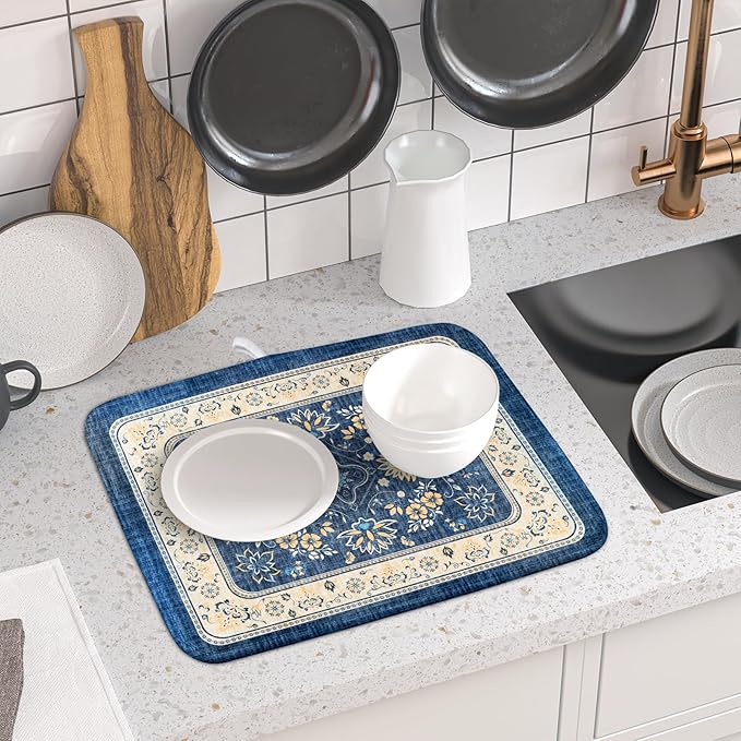 Blue Boho Dish Drying Mat for Kitchen Counter 16x18 Inch Fast Dry Drying Pad Vintage Floral Dish Drainer Rack Mats Coffee Bar Accessories