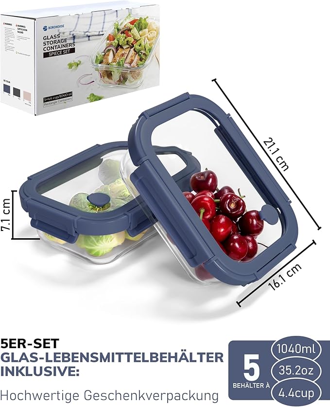 5-Pack Borosilicate Glass Containers with Tempered Lids, 35.2oz/4.4 Cup Airtight Meal Prep Set, Microwave/Freezer Safe (Blue)