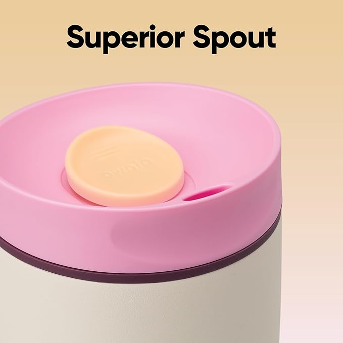 Owala SmoothSip Slider Insulated Stainless Steel Coffee Tumbler, Reusable Iced Coffee Cup, Hot Coffee Travel Mug, BPA Free 12 oz, Pink/Tan (Daybreak)
