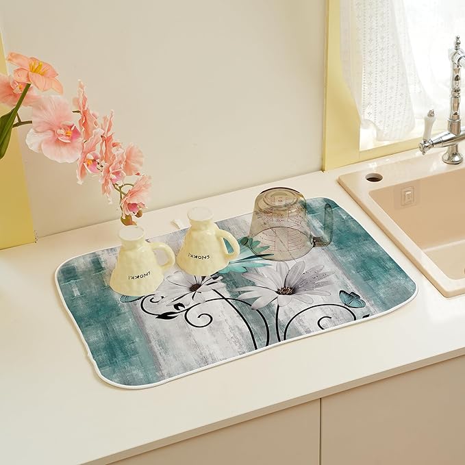 Rustic Daisy Floral Dish Drying Mats 18x24 Inches for Kitchen Counter Vintage Teal Blue Kitchen Decorations Drying Mats Seasonal Outdoor Decor Mat Drying Pad for Office Dining Room Decor