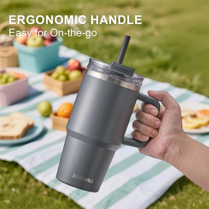 SUNWILL Coffee Tumbler with Handle, 20 oz Travel Mug with Lid and Straw Insulated, Stainless Steel Cup Leak Proof for Travel & Outdoor, Cupholder Friendly, Powder Coated Charcoal