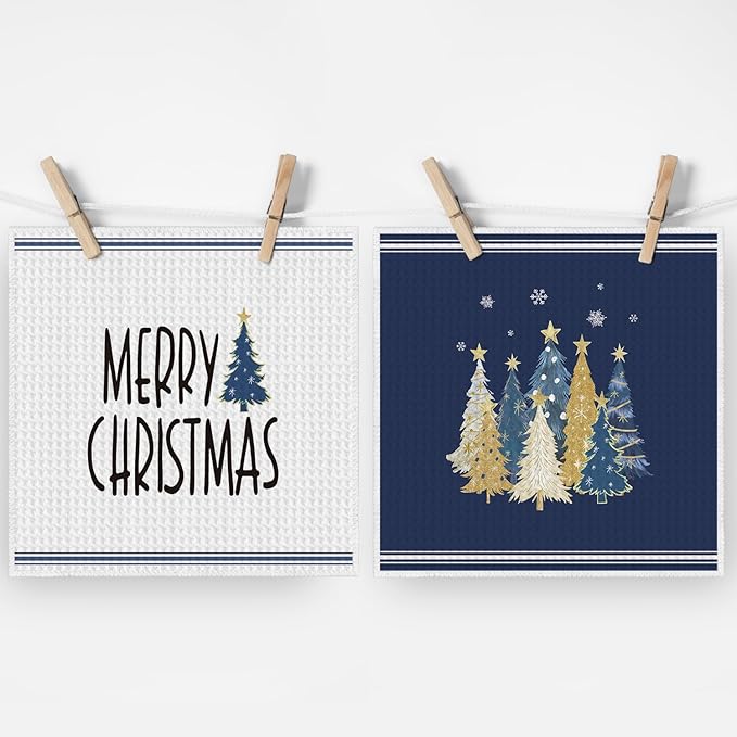 Artoid Mode Blue Star Xmas Tree Merry Christmas Kitchen Dish Cloths, 12x12 Inch Quick Dry Microfiber Dishcloths for Kitchen Dish Rags Set of 2