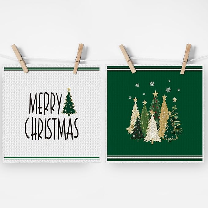 Artoid Mode Green Star Xmas Tree Merry Christmas Kitchen Dish Cloths, 12x12 Inch Quick Dry Microfiber Dishcloths for Kitchen Dish Rags Set of 2