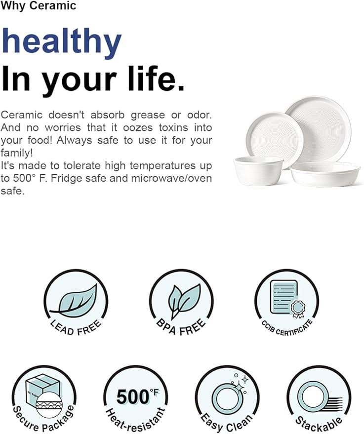 - Durable and Food-Safe Ceramic: High-fired stoneware resists chips and daily wear; protective glaze is lead and cadmium free and safe for food contact, keeping meals pure; strong enough for daily service and easy care with dishwasher and microwave use