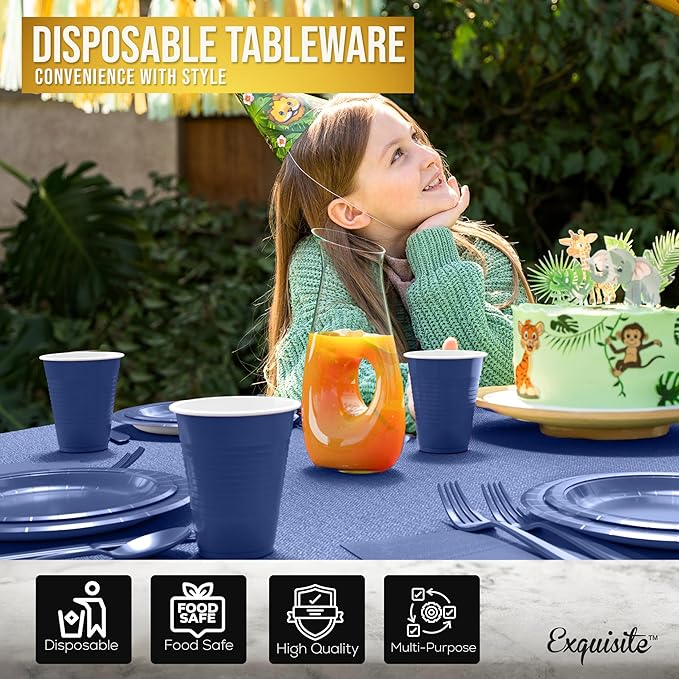 - Easy Cleanup: No dishes to wash! This disposable plates and cups set saves time and stress. With disposable cutlery, dark blue paper plates, and plastic cups, cleanup is quick. Ideal for hosts who want a convenient, no-mess solution with stylish dark blue party supplies.