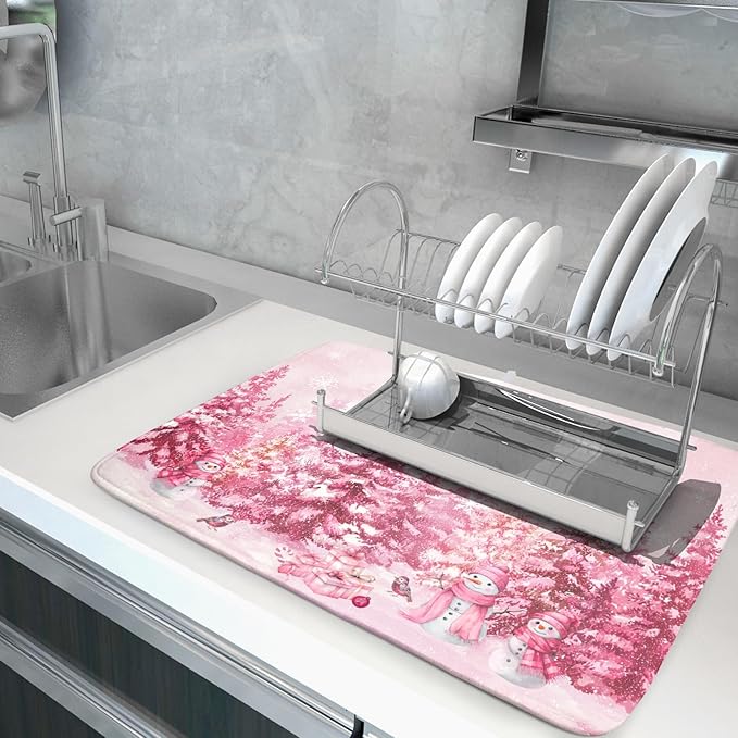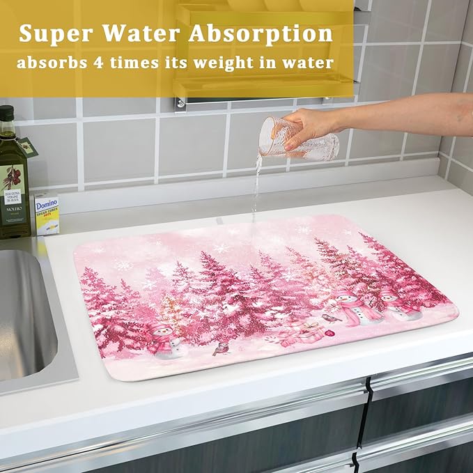 Pink Forest Dish Drying Mat Snowman Washable Drying Matt Kitchen Counter Absorbent Coffee Mat for Winter Home Decor