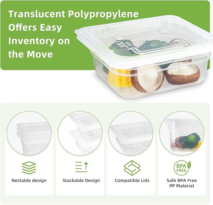 - STACKABLE & SPACE-SAVING: Interlocking sides let these lightweight Polypropylene(PP) plastic food pans stack securely, saving space in your kitchen, cooler, pantry, or fridge—no more cluttered counters or overstuffed cabinets.