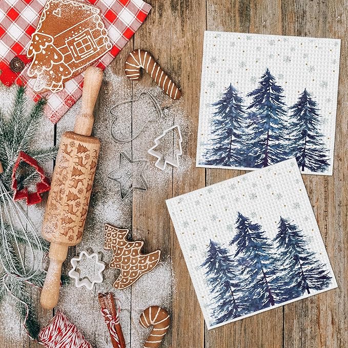Artoid Mode Blue Snowflakes Xmas Tree Christmas Kitchen Dish Cloths, 12x12 Inch Quick Dry Microfiber Dishcloths for Kitchen Dish Rags Set of 2