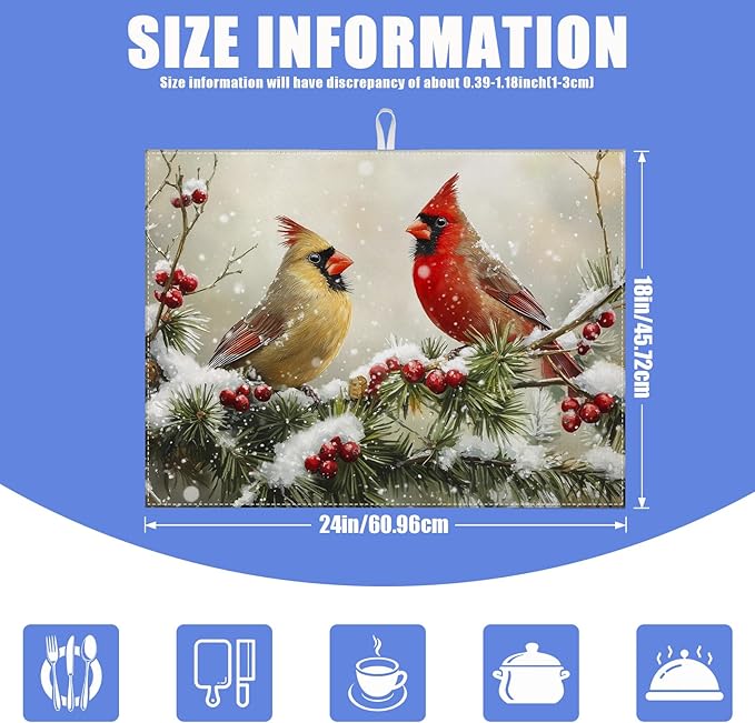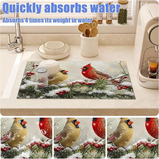 Winter Cardinal Bird Dish Drying Mat for Kitchen Counter Snow Drying Pad Absorbent Reversible Dish Drainer Rack Mats Draining Pad 18"x24"Inch