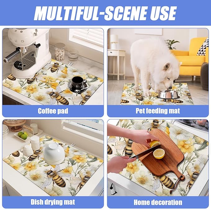 Watercolor Bee Floral Dish Drying Mat for Kitchen Counter Drying Pad Absorbent Reversible Dish Drainer Rack Mats Draining Pad 18"x24"Inch