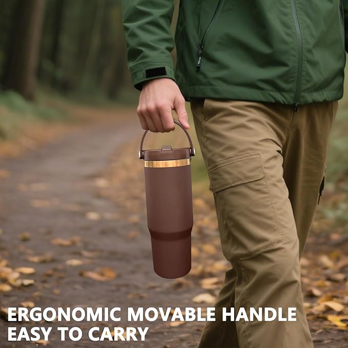 30 oz Tumbler with Handle and Straw, Vacuum Insulated Tumblers with Flip Straw and Top Handle, Leakproof Powder Coated Tumbler, Stainless Steel Travel Mug for Coffee Water (Browm, 1Pack)