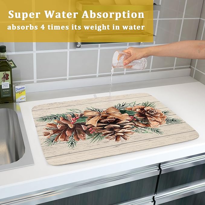 Winter Pine Cone Dish Drying Mat Holly Berries Dish Draining Mat Microfiber Washable Dish Drainer Rack Mat for Home Kitchen Counter 18"x24"