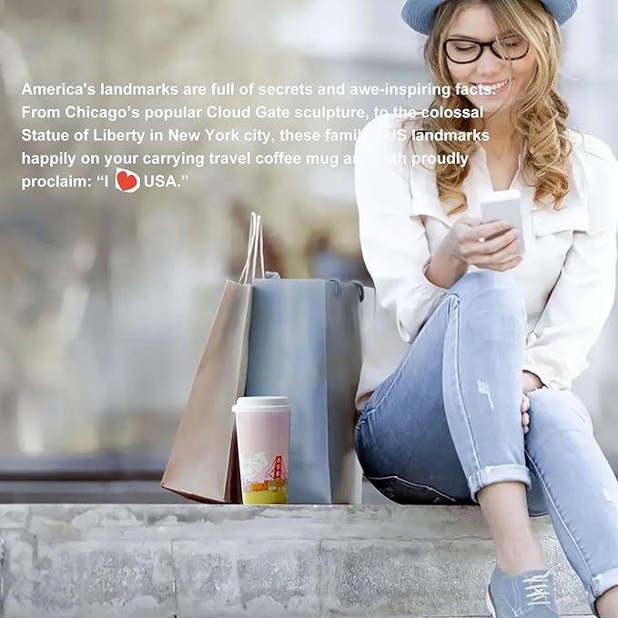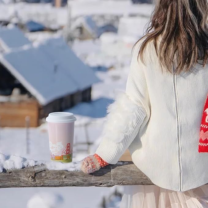 US Landmarks Travel Coffee Mug, Ceramic Coffee Travel Mug with Lid 12 Oz Double-wall To Go Travel Latte Cup for Car-Cup-Holder, Pale Pink for Women Men Girl Boy Sister Friends Birthday Christmas Gift