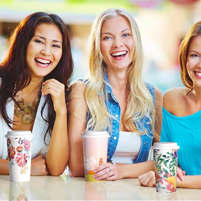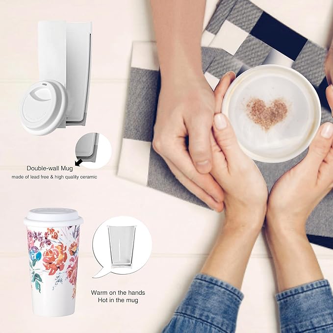 Ceramic Coffee Travel Mug 12 Oz with Lid Spill & Leak Proof, Double-wall Insulated Travel Coffee Mugs Watercolor Peonies Pattern, Gift for Her on Christmas Birthday Mothers Day, White & Pink Flower
