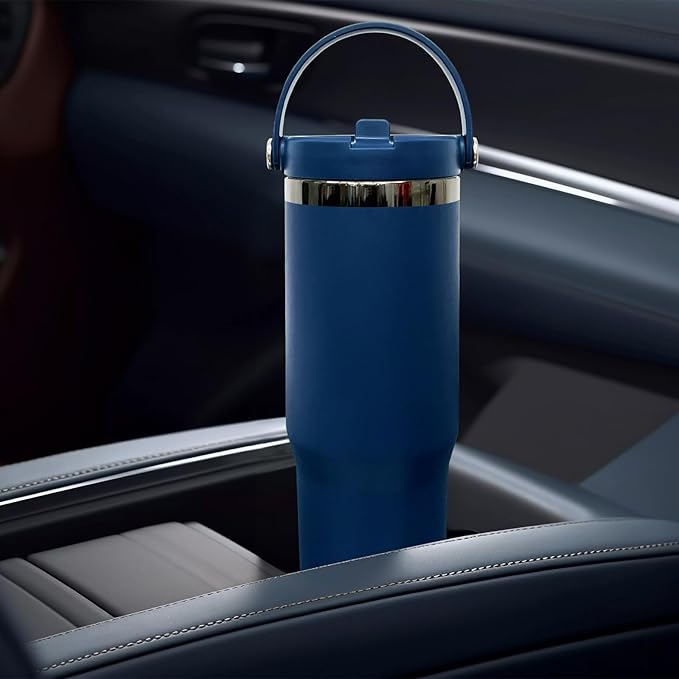 30 oz Tumbler with Handle, Double Wall Vacuum Insulated Tumblers with Flip Straw, Coffee Mug 30oz Powder Coated Cup for Hot and Cold Drinks(Black Plated, Navy,1 pack)