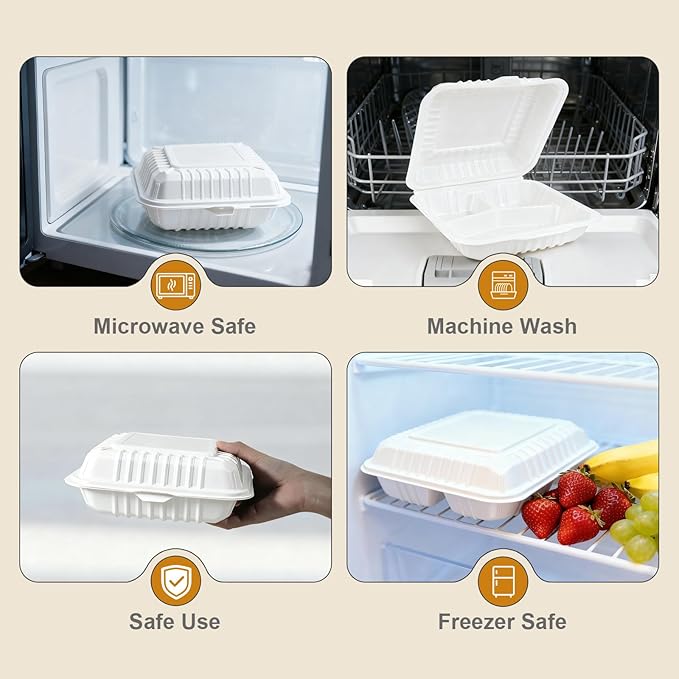 - 3-COMPARTMENT DESIGN – 3-compartment disposable food containers features one large and two small sections to keep main dishes and sides separated. Prevents flavor mixing and cross-contact—ideal for complete meals, lunch boxes, and takeout packaging.