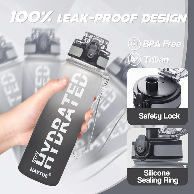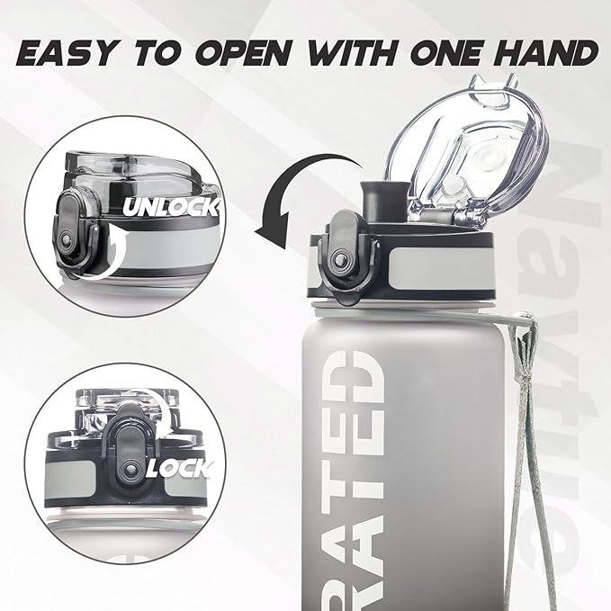 - STAY ON TRACK WITH TIME MARKS: Never miss a hydration goal!Motivational water bottle time markers along the 1l water bottle act as gentle reminders to sip consistently, supporting fitness journeys, metabolism boosts, and overall wellness.Water tracker bottle achieve more by staying optimally hydrated