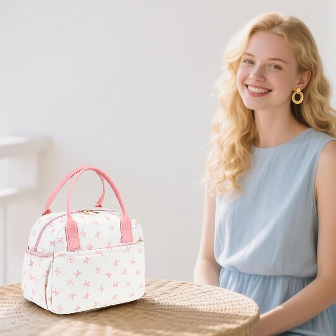 CAMTOP Lunch Box for Women Insulated Lunch Bag Lunchbox Cooler Thermal Leakproof Quilted Reusable Lunch Tote Bag for Work School Travel Picnic (Pink Bow)