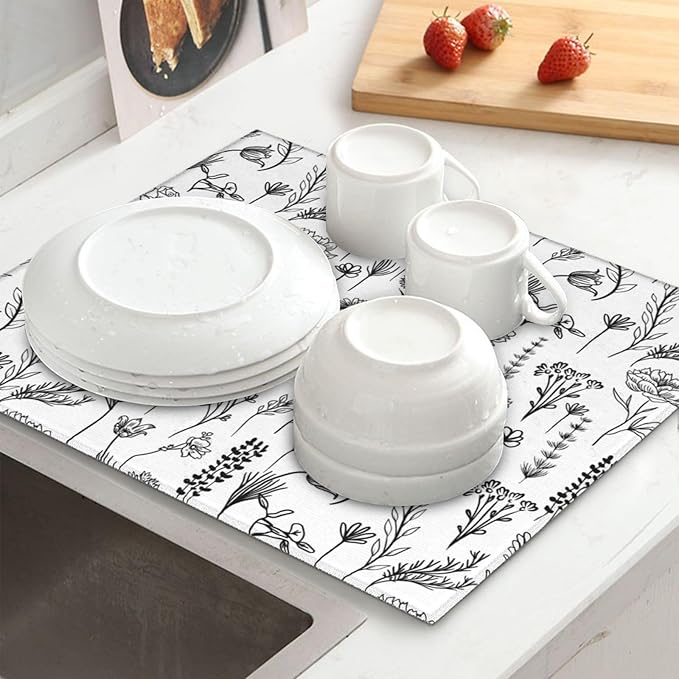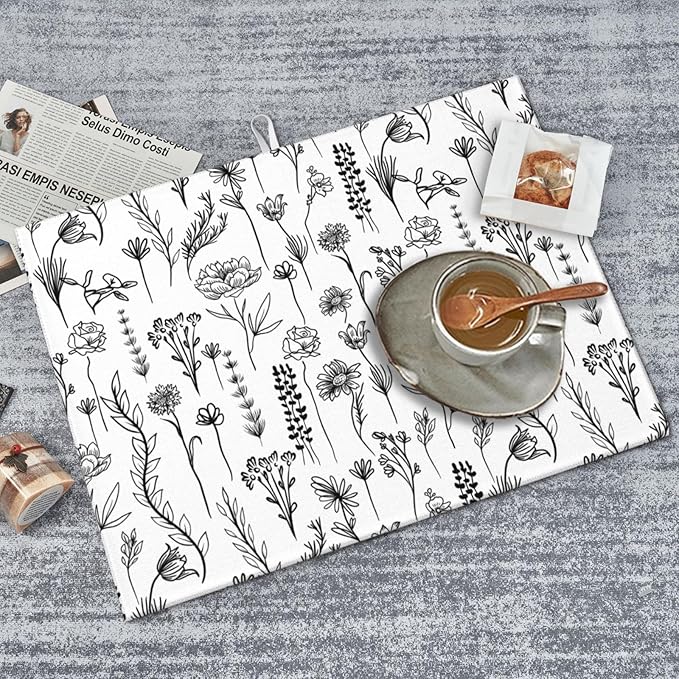 Black and White Floal Kitchen Dish Drying Mat for Counter, Aesthetics Dish Draining Mat Microfiber Absorbent Reusable Washable Extra Large 18"x24" (black and white floral, 18"x24")