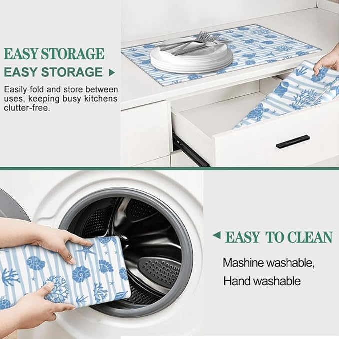 - [Foldable and Hangable]: The drying mat is machine washable, easy to clean and store. Fold and slip into a drawer or cabinet when not in use. The mat can also be hung on the hook with the tape.