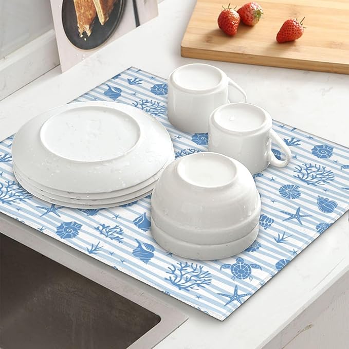 Beach Coastal Kitchen Dish Drying Mat for Counter, Ocean Sea Dish Draining Mat Microfiber Absorbent Reusable Washable Extra Large 18"x24" (beach, 18"x24")