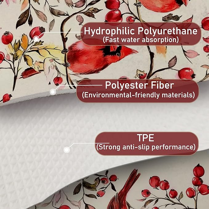 Christmas Red Cardinal Dish Drying Mat, Christmas Berry Tree Cardinal Coffee Bar Mat for Countertops, Rustic Xmas Absorbent Dish Drying Mats for Kitchen Counter Coffee Maker, 16x24 Inch
