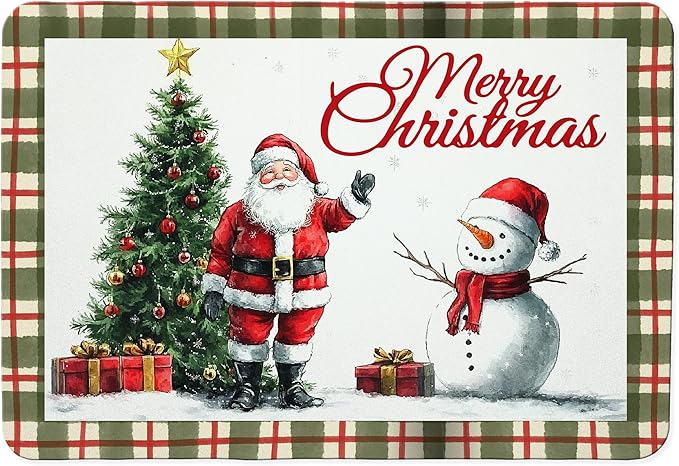 Red and Green Plaid Christmas Dish Drying Mat, Christmas Tree Santa Snowman Coffee Bar Mat for Countertops, Retro Xmas Absorbent Dish Drying Mats for Kitchen Counter Coffee Maker, 16x24 Inch