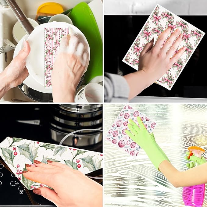 - What You Get: 6 pieces Swedish dish cloths featuring a pink Christmas design with cute Santa motifs, packaged in a gift box, ready to add festive charm to your Christmas kitchen cleaning routine