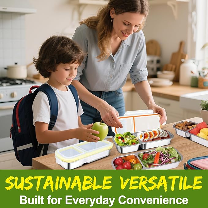 - 【Versatile 3-Compartment Design for Snacks, Fruits & Sauces】The divided stainless steel bento box features 3 leak-proof compartments to separate snacks, fruits, dips, or sauces without mixing flavors. Ideal for meal prep, picnics, or school lunches, it’s a reusable snack container with lids that prevents spills.
