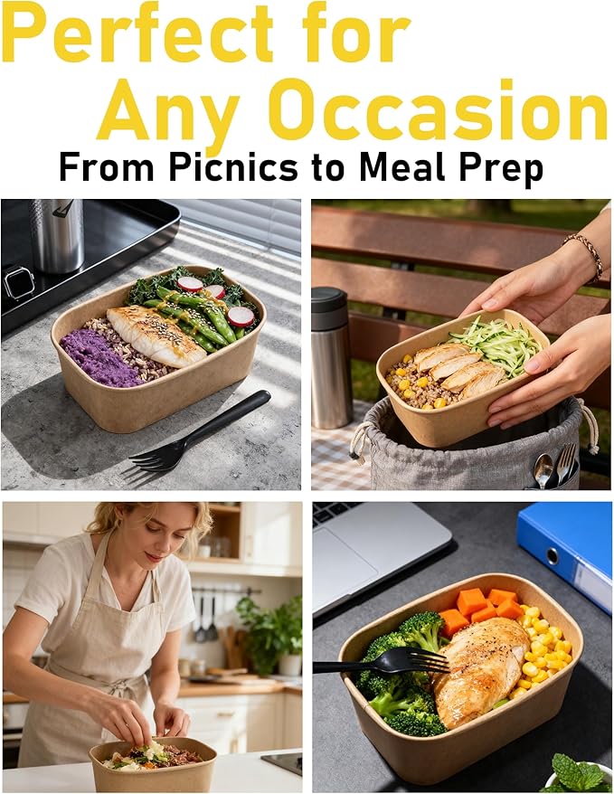 - 【Versatile Disposable Bowls for Home & Business】 From backyard BBQs to professional catering, these kraft take out bowls deliver unmatched versatility. High-quality paper meal prep containers with lids and forks, can be used conveniently anytime and anywhere. Perfect for lunch boxes, pasta dishes, salads or creamy soups - saving time for both owners and businesses. Buy in bulk to save costs and delight your customers with practical packaging!