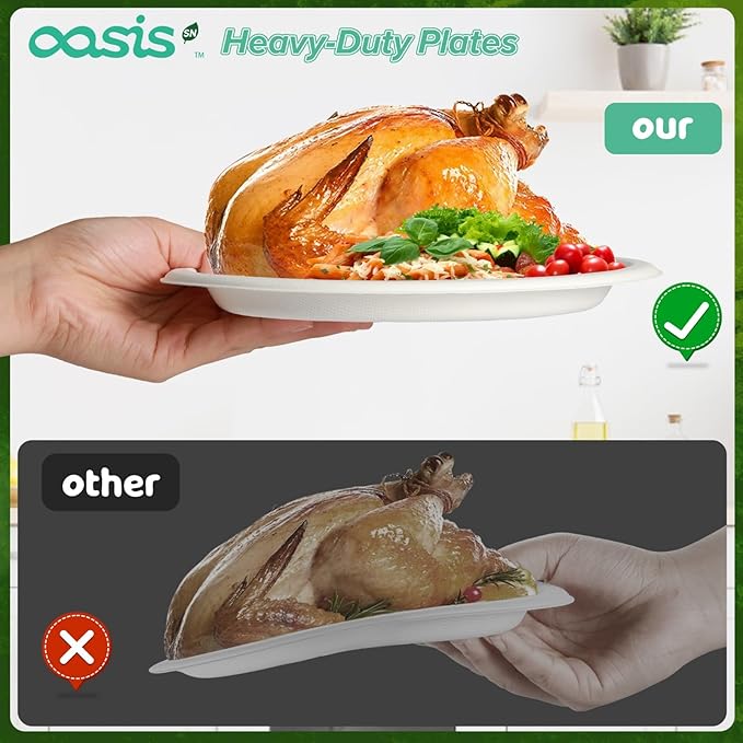 - 🍽 Sturdy & Reliable - Made from heavy-duty sugarcane bagasse, the plates hold up to hot, cold, oily, or saucy foods without soaking or bending.