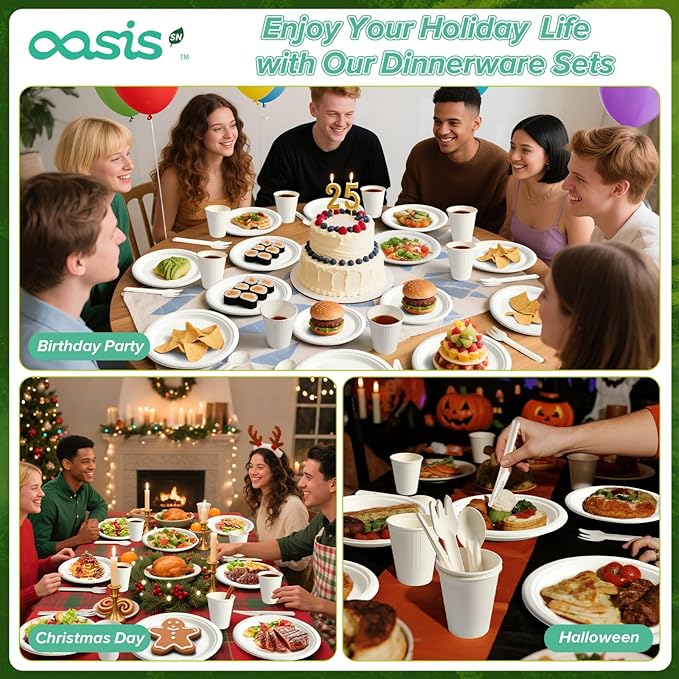 - 🌿 Complete Eco-Friendly Set - Includes 6" & 9" compostable plates, durable cutlery, and large 12"x12" napkins—everything you need for a full-service meal.