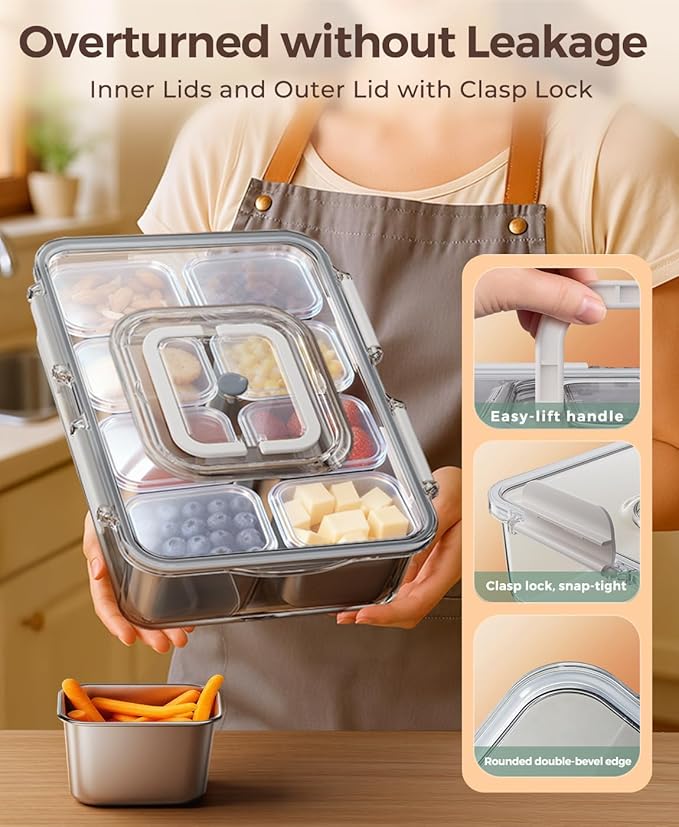 Snackle Box Container with 8 Removable Stainless Steel Compartments Divided Snack Tray with Portable Handle for Beach, Road Trip, Picnic, Boat Days, Ball Games, Pool and Parties