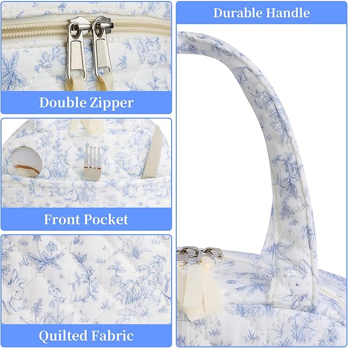 Quilted Lunch Box for Women,Insulated Cute Reusable Lunch Bag with Front Pocket,Pink Flower Stylish Lunch Tote Bag for Work, Office,Picnic, Travel,School (blue floral rabbit)