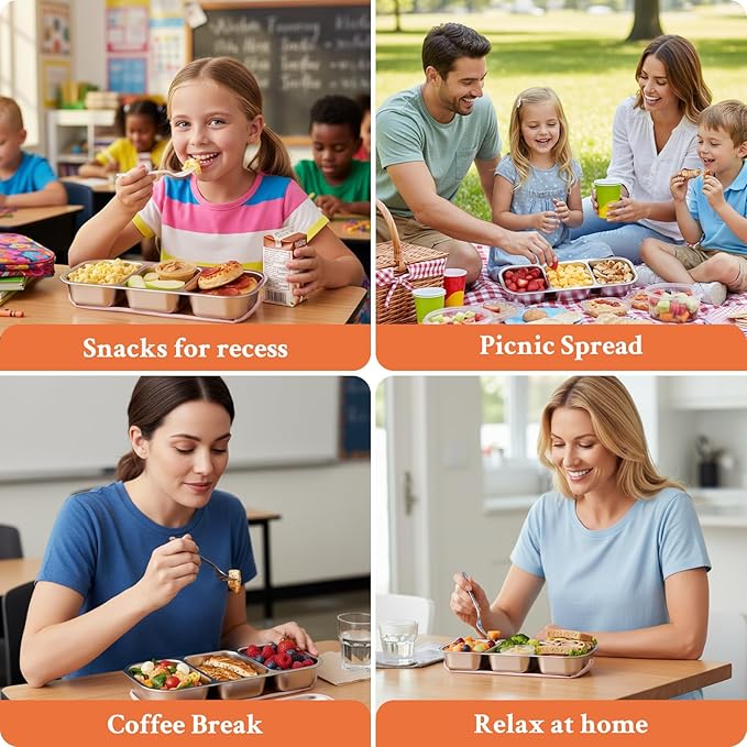 - 3-in-1 Stainless Steel Snack Containers: The 3 compartment design lets you carry a greater variety of fruits and foods at once, making it easier to maintain a balanced diet. The food-grade silicone lids provide an airtight, leak-proof seal to keep contents fresh, ensuring worry-free transport.