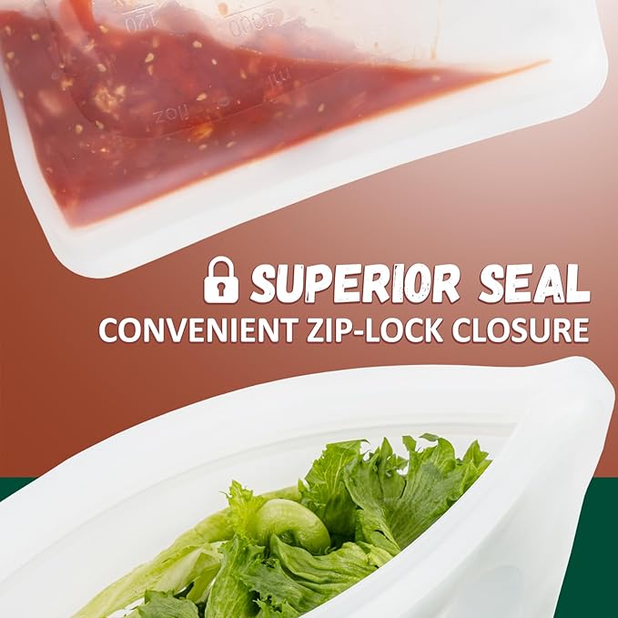- 【ZIP-LOCK SEAL】 The reusable silicone bags feature a hassle-free zip-lock closure—no loose lids to lose. The strong seal locks in freshness and prevents leaks. Soft and compressible, they save space once the air is pressed out