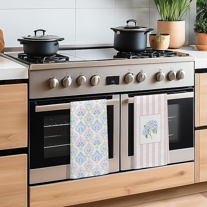 Pink and Blue Grandmillennial Hydrangea Floral Kitchen Dish Towels, Pink Striped Flower Decorative Hand Towels for Bathroom Kitchen, Preppy Floral Bathroom Decor, 16x24 Inch Set of 2