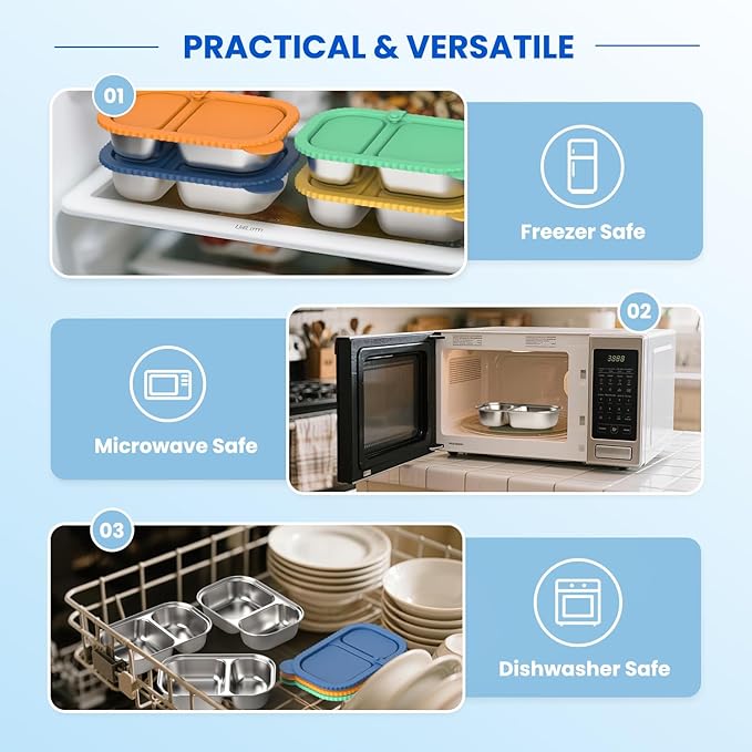 - 【 Versatile for All Uses & Occasions】These stainless steel lunch boxes are highly versatile for storing a wide range of foods: snacks, sauces/dips, yogurt, oatmeal, nuts, gummies, spices, grapes, boiled eggs, sliced fruit, chips, applesauce, fresh herbs, chopped vegetables, turkey slices, or condiments. They’re ideal for picnics, road trips, sports events, beach outings, and daily use—whether at home, in the office, in the car, on a plane, or even on a boat.