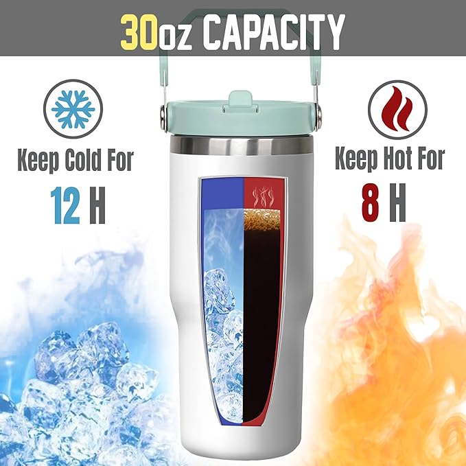 - 30OZ LARGE CAPACITY WITH HANDLE – Spacious enough for coffee, tea, water, or iced drinks. The sturdy carry handle makes it easy to take your tumbler on the go – to work, the garden, or outdoor adventures.