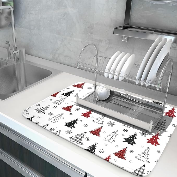 Xmas Dish Drying Mat for Kitchen Counter Black White Trees Festival Microfiber Absorbent Dish Draining Reusable Washable Foldable Extra Large 18"x24"