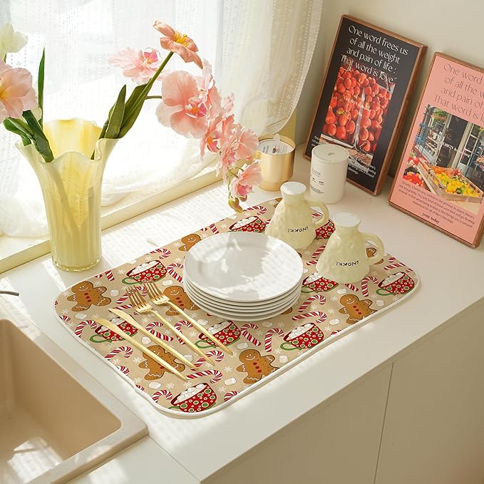 - 【Unique Design】This is gingerbread dish drying mats features a gingerbread man candy cane snowflake design, pattern is only on the front and no printing on the back. This christmas kitchen mat feature eye-catching patterns that add a pop of color to your kitchen