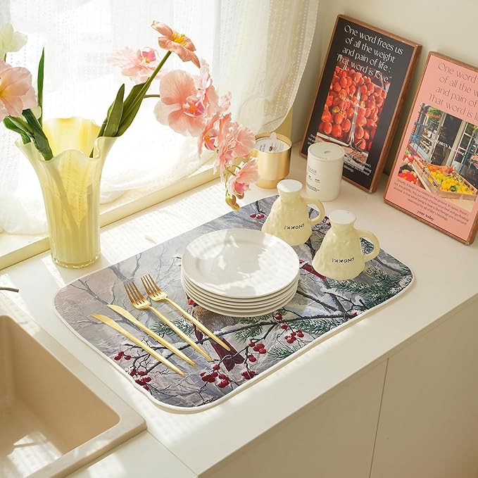 Christmas Dish Drying Mats 18x24 Inch Snow Red Bird Drying Mats Xmas Farmhouse Winter Holiday Kitchen Decor Absorbent Drying Pad Rack Drainer Mats for Kitchen Dining Room Counter