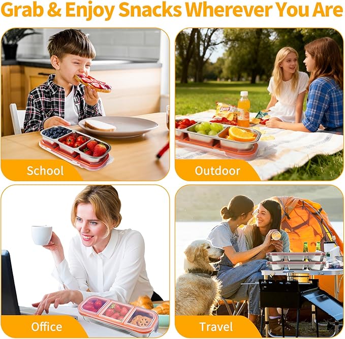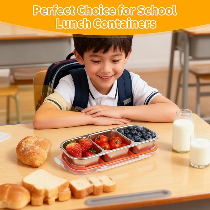 3 Pack 304 Stainless Steel Snack Containers, Reusable Leek Proof Metal Lunch Box with 3 Compartment, Food Storage Containers for Home, Work, Travel