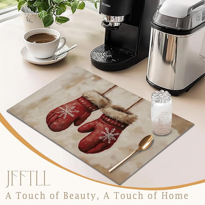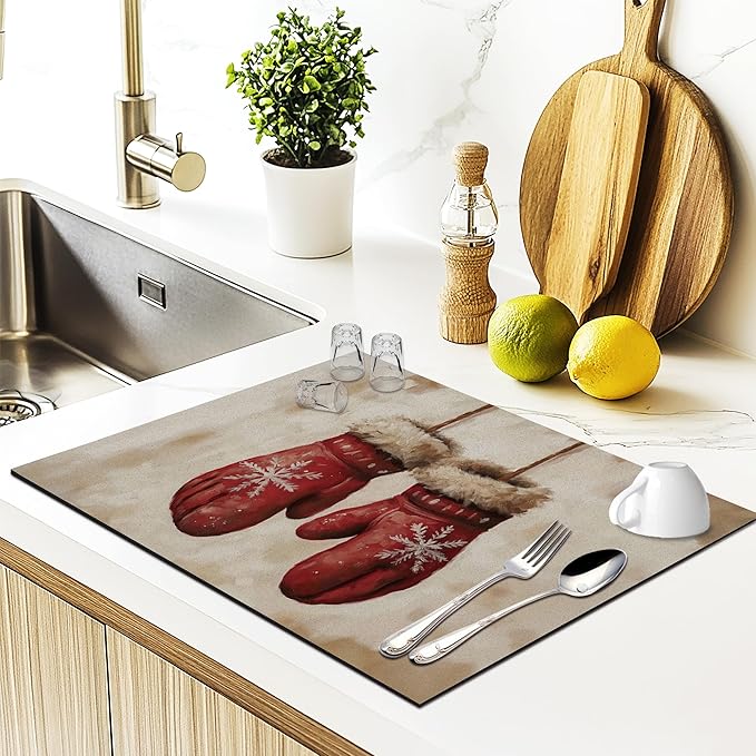 Rustic Christmas Mittens Dish Drying Mat, Vintage Winter Xmas Absorbent Dish Drainer Reusable Washable Drying Mat Pad for Kitchen Counter, Farmhouse Christmas Decor, 12×15 Inch