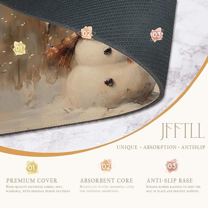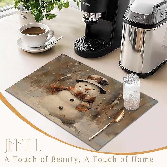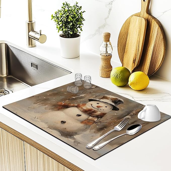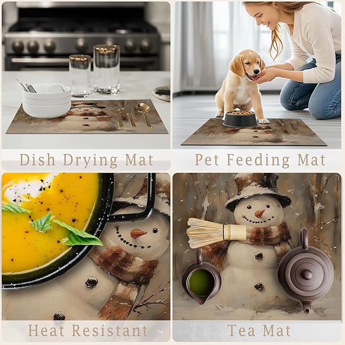 Winter Christmas Snowman Dish Drying Mat, Vintage Xmas Holiday Absorbent Dish Drainer Reusable Washable Drying Mat Pad for Kitchen Counter, Rustic Christmas Decor, 12×15 Inch