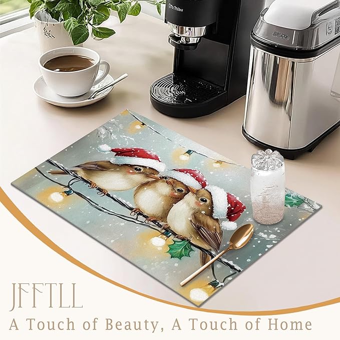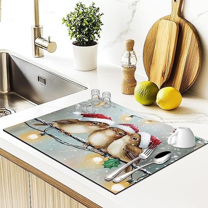 Winter Christmas Bird Dish Drying Mat, Bird Lover Gifts, Rustic Winter Xmas Sparrow Birds Absorbent Dish Drainer Reusable Washable Drying Mat Pad for Kitchen Counter, 12×15 Inch