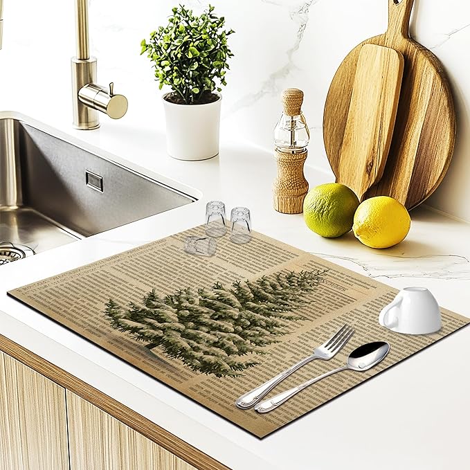 Vintage Christmas Tree Dish Drying Mat, Retro Spruce Xmas Tree Newspaper Absorbent Dish Drainer Reusable Washable Drying Mat Pad for Kitchen Counter, Rustic Christmas Decor, 12×15 Inch