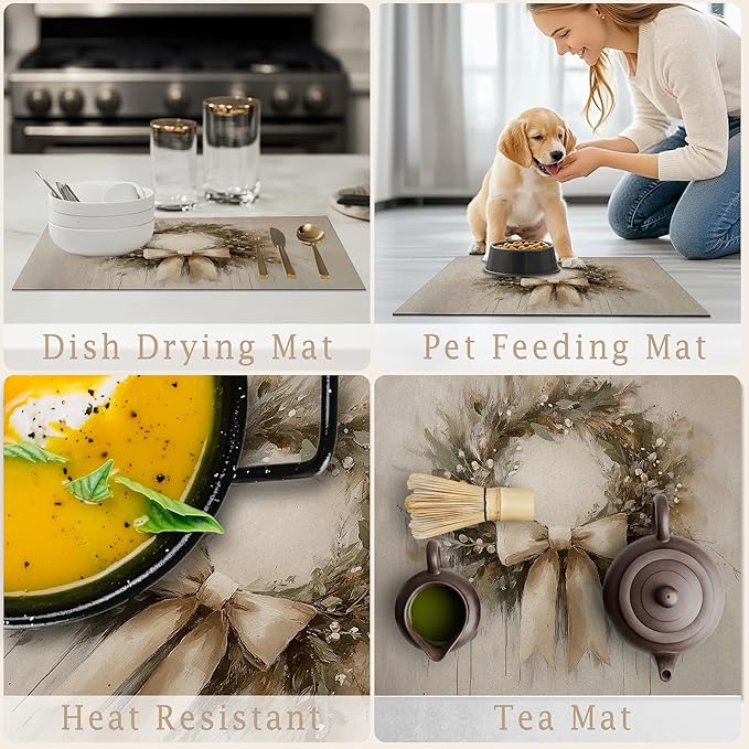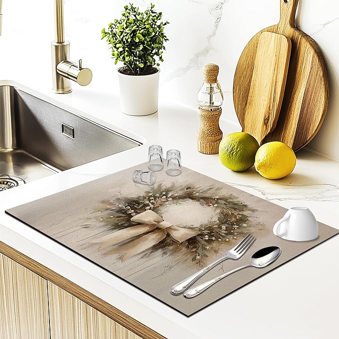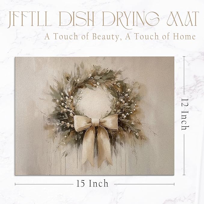 Christmas Wreath Dish Drying Mat, Vintage Winter Xmas Holiday Absorbent Dish Drainer Reusable Washable Drying Mat Pad for Kitchen Counter, Farmhouse Christmas Decor, 12×15 Inch