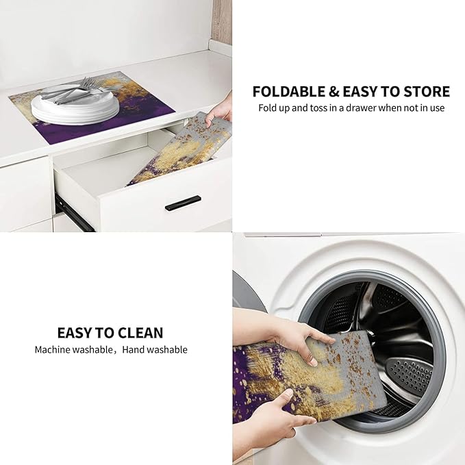 - Unique Purple Gold Abstract Design: Stand out with this cute decorative drying mat featuring a modern purple and gold abstract art pattern. It’s not just an absorbent drying mat but also a modern drying mat that adds a touch of art to your kitchen decor, perfect as a countertop drying mat with artistic flair