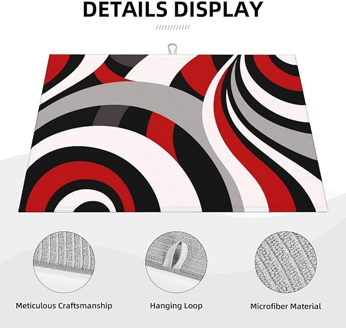 - Unique Red Black Gray Geometric Wave Design: Stand out with this decorative drying mat featuring a modern red, black, gray geometric wave pattern. It’s not just an absorbent drying mat but also a stylish kitchen counter mat that adds a touch of modern art to your kitchen decor, perfect as a countertop drying mat with geometric flair. The reverse side is pure gray, and there's a hanging loop for easy storage, combining functionality with a unique design